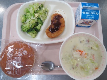 きょうの献立は こどもパン・白花豆コロッケ・グリーンサラダ・ クラムチャウダー・牛乳です。 エネルギー 860kcal たんぱく質 30.6g 脂 質 28.9g 食塩相当量 3.8g きょうの献立は、生徒に大人気 ほぼ完食で調理員さんも大喜びです |