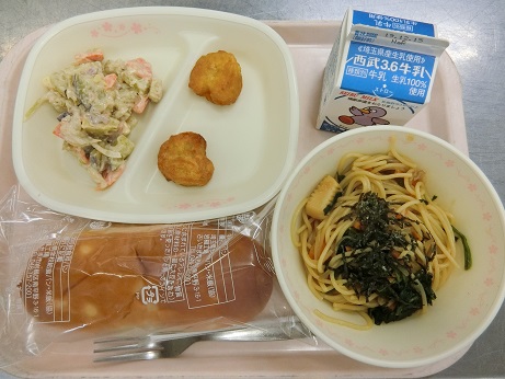 きょうの献立は パインパン・和風スパゲティ・チキンナゲット・さつまいものサラダ・牛乳です。