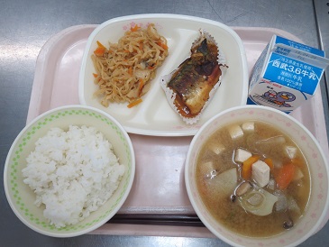 きょうの献立は ごはん・さばねぎみそ焼き・切り干し大根の炒り煮・