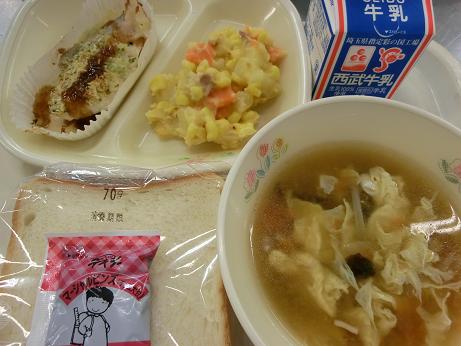 パン粉焼き・夏風スープ・コーンとじゃが芋の炒め煮