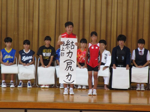 新人兼県民大会の壮行会が行われました。各部の2年生を中心に考えた、大会への意気込みの言葉を部長が代表して発表しました。