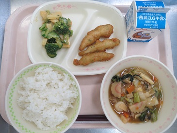 うま煮丼・わかさぎフリッター・ポテトのさっぱりサラダ・牛乳