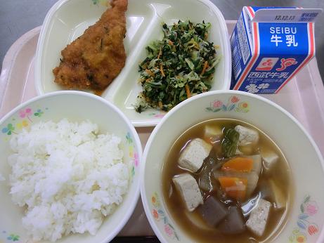 きょうは、 かつ丼(カレー風味)・牛乳・けんちん汁・磯の香あえ でした。かつ丼は、ごはんにたれがたっぷりとしみ込んだ チキンカツをのせて食べていただくメニューです。きょうは衣と たれにカレー粉を加えていつもと違う味にしました。 けんちん汁は、寒い時期には体が温まります。 |