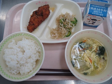きょうの献立は かつ丼・大根とじゃこのサラダ・コーン入り華風スープ・牛乳です。 エネルギー 827 kcal たんぱく質 38.0 g 脂 質 24.0 g 食塩相当量 3.4 g