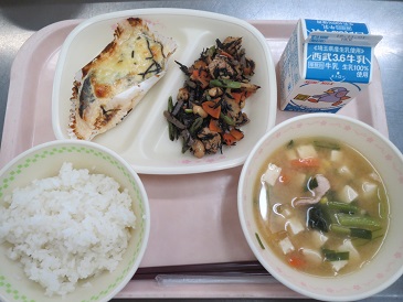 ごはん・白身魚の明太マヨ焼き・大豆の磯煮・どさんこ汁・牛乳