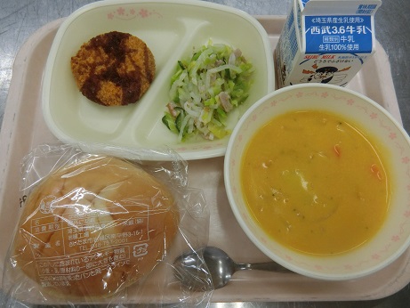 メンチカツサンド・ハムと大根のサラダ・豆乳キャロットスープ・牛乳