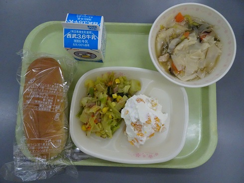 きょうの献立は フルーツクリームサンド・わんたんスープ・キャベツのペペロンチーノ・ 牛乳です。 エネルギー 801 kcal たんぱく質 24.9g 脂 質 28.2g 食塩相当量 3.6g