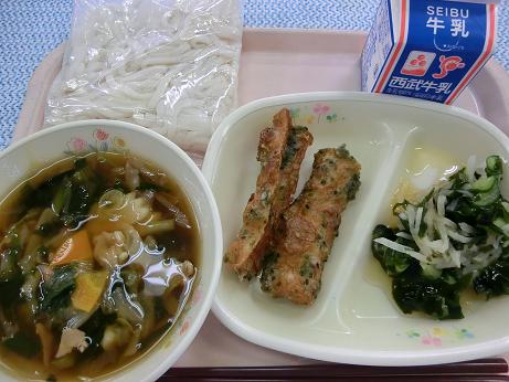 肉うどん・牛乳・ちくわの石垣揚げ・だいこんとわかめの