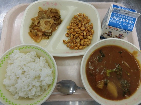 冬野菜のカレーライス・大豆のカリカリ揚げ・手作り福神漬け・牛乳