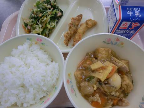 きょうは、 ごはん・牛乳・生揚げの中華煮・わかさぎフリッター 深谷ねぎのナムルでした。 生揚げは、タンパク質や鉄分をおおく含む食材で栄養 たっぷりです。中華煮にするとごはんのおかずとしても おいしくいただけます。