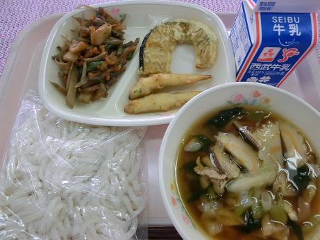 きょうは、五 目うどん・牛乳・かぼちゃの天ぷら・わかさぎフリッター きんぴらでした。きんぴらを給食に出すのはひさしぶりです。 かみごたえがあるのでよくかんで食べて欲しいのですが、 生徒のみなさんからはちょっと敬遠しがちな料理のようです。 |