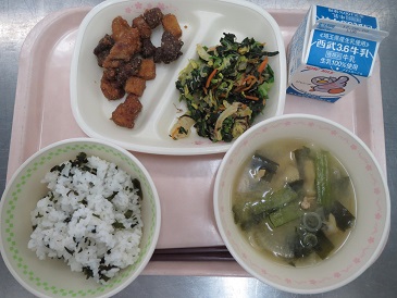 わかめごはん・豚肉と高野豆腐のごまだれ・磯の香あえ・