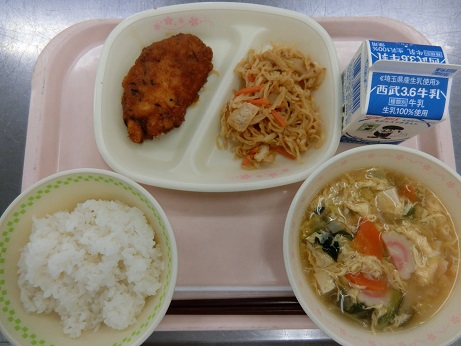 きょうの献立は カレー風味かつ丼・切干大根の炒り煮・かき玉汁・牛乳です。