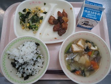 わかめごはん・豚肉と高野豆腐のごまだれ・大根とじゃこのサラダ・