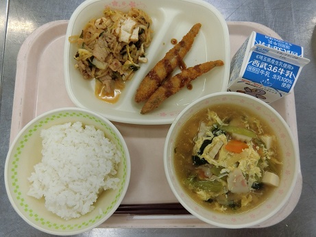 きょうの献立は ごはん・豚肉と切干のキムチ炒め・ししゃもフライ・かき玉汁・牛乳です。