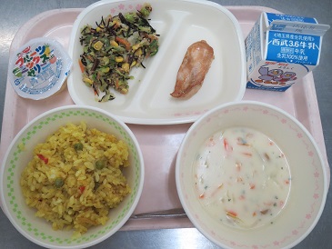 きょうの献立は カレーピラフドリア風・鶏肉の照り焼き・ツナとひじきのサラダ・ フルーツFeゼリー・牛乳です。 エネルギー 825 kcal たんぱく質 40.0g 脂 質 21.4g 食塩相当量 3.7g