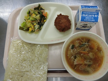 肉野菜ラーメン・おからドーナツ・海藻サラダ・牛乳