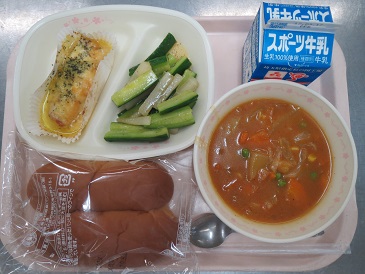きょうの献立は 黒パン・チキン香味焼き・スティック野菜・メキシカンシチュー・ スポーツ牛乳です。 エネルギー 835kcal たんぱく質 40.4g 脂 質 25.0g 食塩相当量 3.1g メキシカンシチューは、チリパウダー・カレー粉で味付けをしています。 チリパウダーは、メキシコから北アメリカにかけての料理、スペイン料理 などでよく使われます。 ピリ辛で食欲がでました