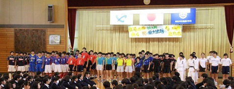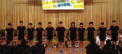 10月20日(金)放課後、新人戦の壮行会を全校で行いました。今年の新人戦は、11の部(男女別では柔道・陸上で13)などが出場します。既に陸上競技は終わっており、男子が総合優勝を成し遂げています。会場には、美術部の生徒が作成してくれた横断幕が掲げられていました。学総のときも同じもので良い結果を出しています。さあ、頑張れ幡羅中学校!陸上部に続け!