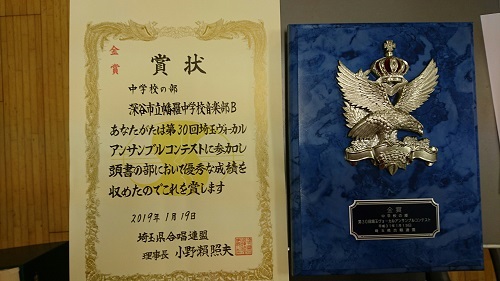 本日開催された第30回ヴォーカルアンサンブルコンテストで幡羅中音楽部A(1年生)、B(2年生)がダブルで金賞を受賞しました。  |