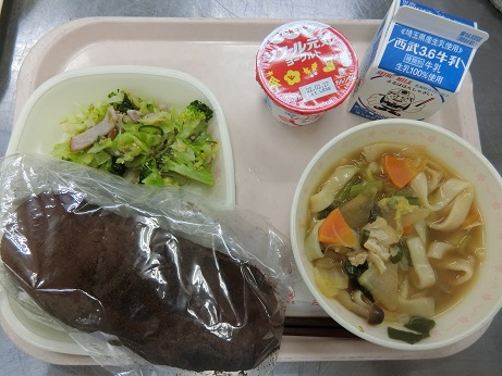 ココア揚げパン・ふっかちゃん野菜のごまごまサラダ・煮ぼうとう・ヨーグルト・牛乳
