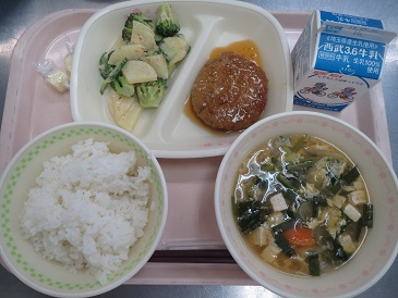 きょうの献立は ごはん・豆腐ハンバーグ・ポテトのさっぱりサラダ・ニラ玉汁・ チーズ・牛乳です。 エネルギー 825 kcal たんぱく質 30.8 g 脂 質 26.3 g 食塩相当量 2.5 g