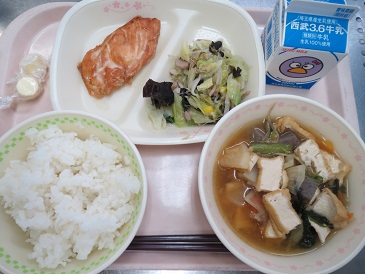 きょうの献立は ごはん・鶏の照り焼き・野菜炒め・豚汁・牛乳です。 エネルギー 813 kcal たんぱく質 41.3 g 脂 質 25.2 g 食塩相当量 2.7 g