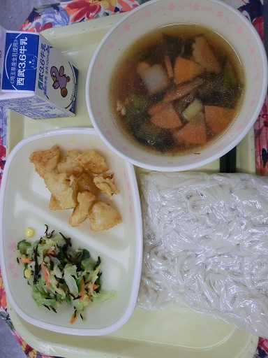 きょうの給食☆ 深谷ねぎたっぷりうどん みそポテト ツナとひじきのサラダ 牛乳