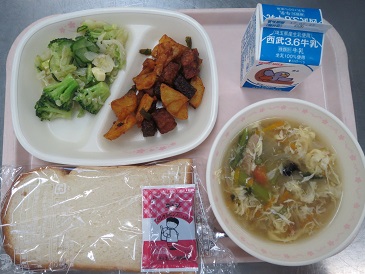 きょうのスープには、夏野菜のとうもろこし・オクラ・トマトがたっぷり入っています。