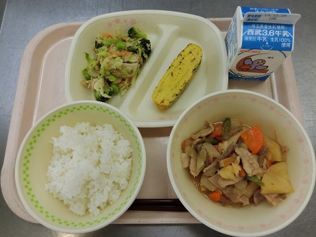 きょうの献立は ごはん・肉じゃが・ひじき入り厚焼き卵・温野菜・牛乳です。