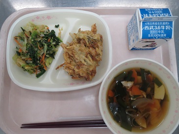 肉うどん・かき揚げ・おかかあえ・牛乳