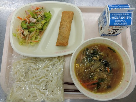 ごまみそラーメン・春巻き・春雨サラダ・牛乳