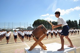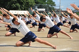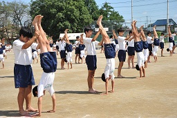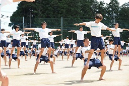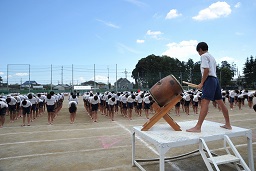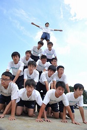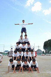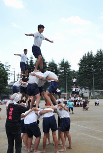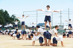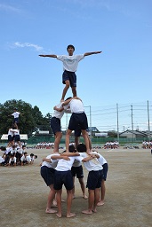 幡中男子伝統の組体操。深谷市内でももはや幡中でしか見ることができない演技で、会場には通路まで見物人で溢れるくらい大勢の方にご覧いただきました。本年度も完成度が高く、ピラミッドやタワーでもすべて完成するというものでした。幡中生の集中力の高さ、技能の高さを証明してくれました。