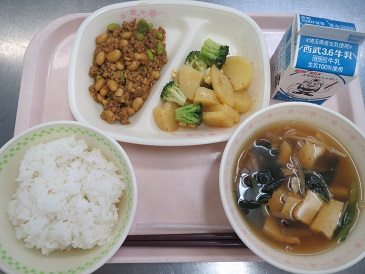 きょうの献立は ソイ丼・じゃがいものさっぱりサラダ・沢煮椀・牛乳です。
