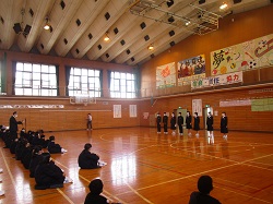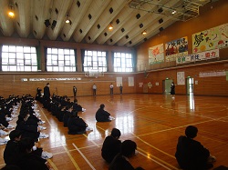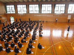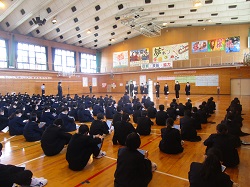 対面式が行われました。感染症対策のため、1年生のみ体育館に集合し、2、3年生は教室で視聴するTeamsによるリモート形式で行いました。