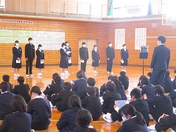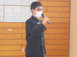 生徒会長の挨拶の後、生徒会本部役員、各専門委員会の委員長がそれぞれの活動の様子を紹介しました。1年生も代表生徒が感謝の言葉を発表しました。