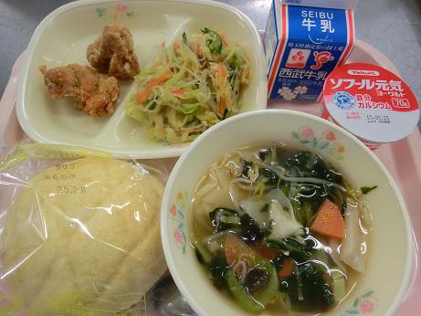 きょうは、 メロンパン・牛乳・から揚げ・ワンタンスープ 春雨サラダ・ヨーグルトでした。 きょうは3年生を送る会が行われました。 給食では3年生のみなさんから卒業前にもう一度食べたい 給食をリクエストしてもらい、希望が多かったものを献立に 取り入れて実施しました。どのクラスも残りがなく食缶が 空っぽになって返ってきました。