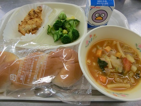 ツイストパン・牛乳・チキンフレーク焼き・ミネスト