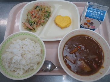 きょうの献立は ハヤシライス・オムレツ・春雨サラダ・牛乳です。