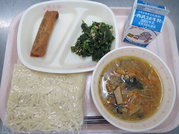 きょうの献立は ごまみそラーメン・ひじき入り春巻き・ほうれん草サラダ・牛乳です。 エネルギー 822 kcal たんぱく質 28.8g 脂 質 30.3g 食塩相当量 4.9g