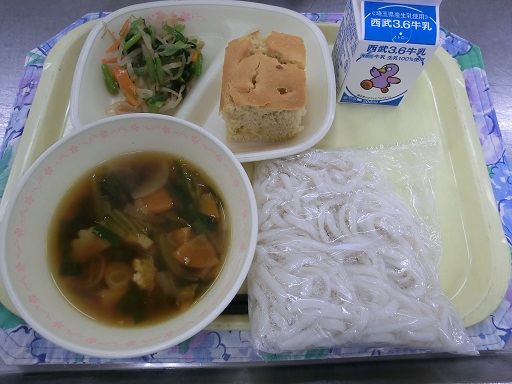 きょうは肉うどんと2種類の天ぷらの献立です。まだまだ暑い日が続いていますが、旬のおいしい食べ物を味わうことで少しずつ