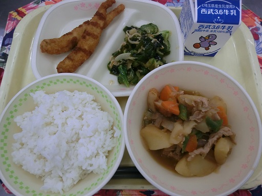 「みそポテト」は秩父地方の郷土料理で、深谷市の給食でもたびたび紹介しています。「ほうれん草とひじきのサラダ」もツナが入ってほうれん草をたくさん食べることができる人気のサラダです。